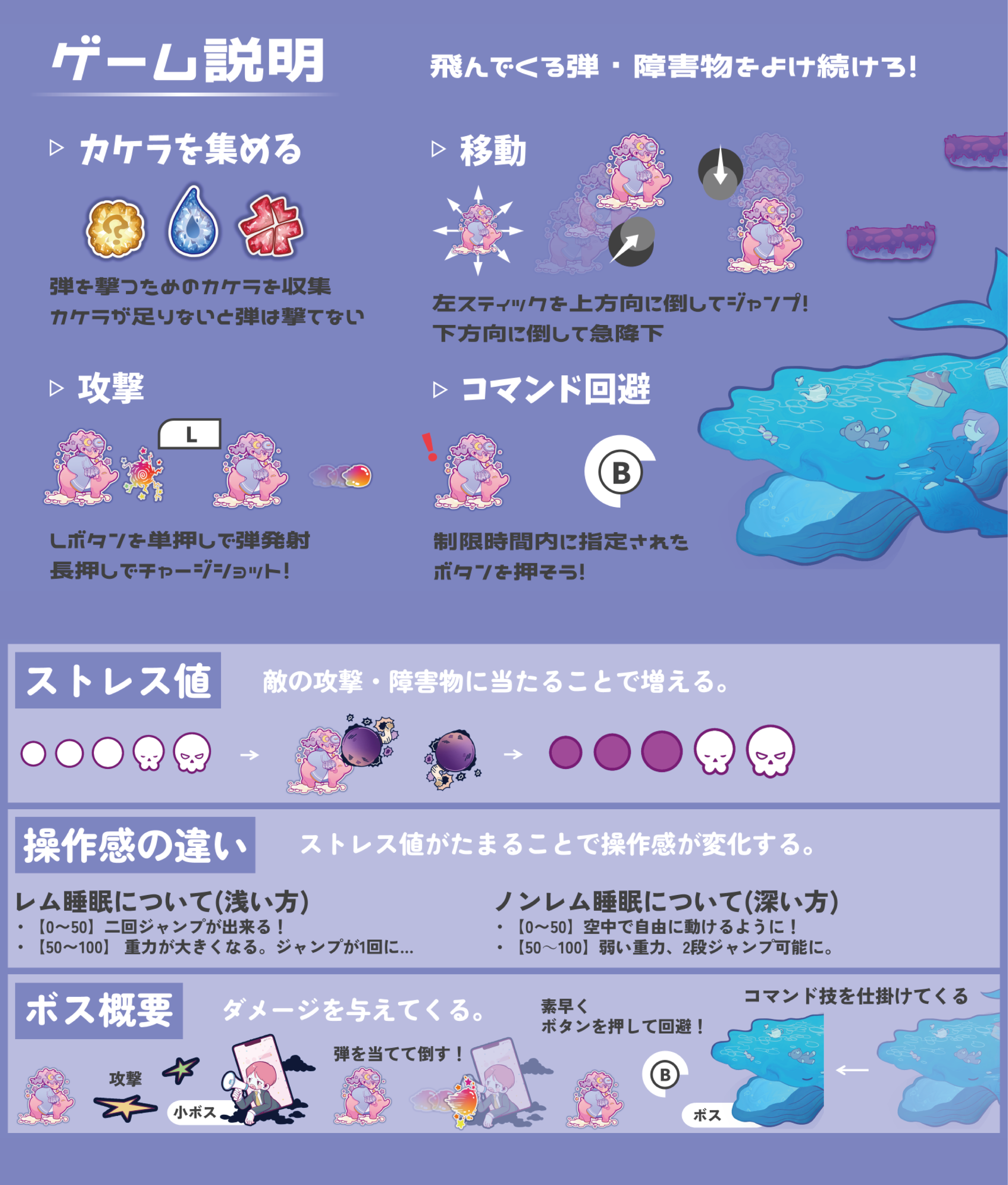 夢と現実のはざまを冒険する2D横スクロールアクションゲームです。